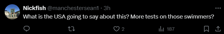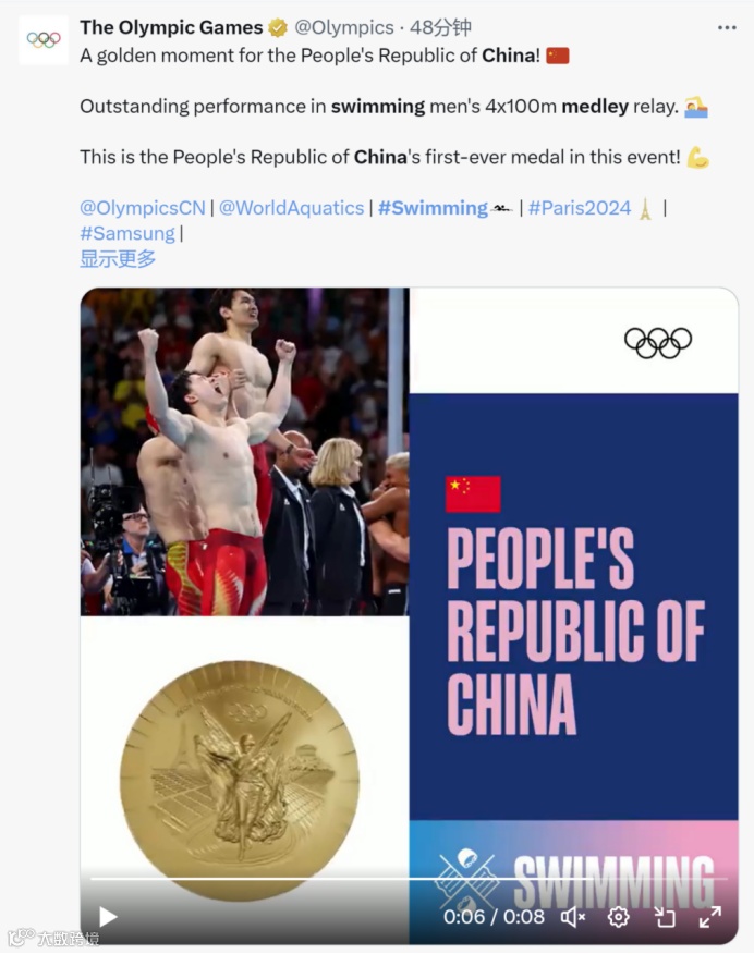 而拥有654万粉丝的国际奥林匹克组委会称赞中国队在男子4x100米混合泳接力中表现超群,为中国赢得在此项目中的第一枚奥运奖牌。