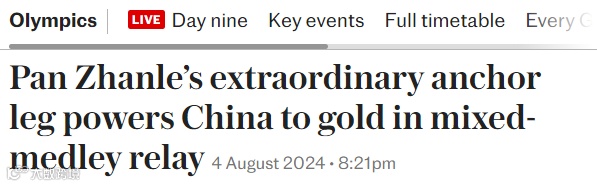 英国《每日电信报》称潘展乐超强发挥让中国赢得4x100米混合泳接力金牌。