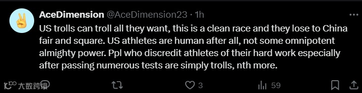 美国的喷子们想怎么挑衅都行,但这场比赛是公平的,美国队在这场比赛中输给了中国队。毕竟,美国运动员也是人类,并不是无所不能的神祇。那些在运动员经过多次测试后仍然贬低他们刻苦努力的人,完全只是喷子罢了,仅此而已。