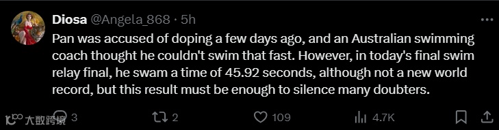 几天前,潘展乐被指控使用兴奋剂,一位澳大利亚游泳教练认为他不可能游得这么快。然而,在今天的混合泳接力决赛中,他以45.92秒的成绩游完,这个成绩足以让许多质疑者闭口无言。
