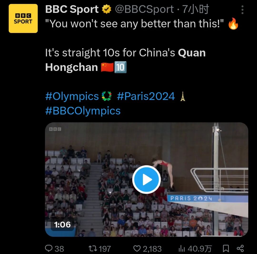 美国全国广播公司NBC在其报道开篇则引用了一句俗语:“不看你怎样开始,就看你怎样结束。”但是全红婵在第一跳后所有7名评委都给出了10分的满分,这样的开始是后来任何选手都无法超越的。