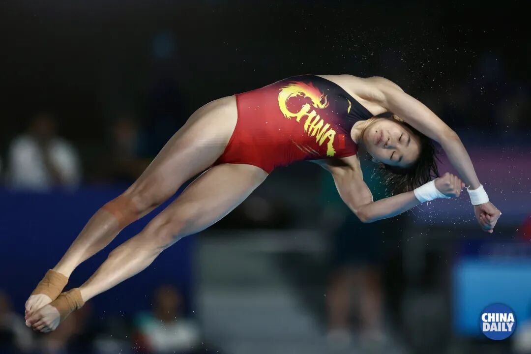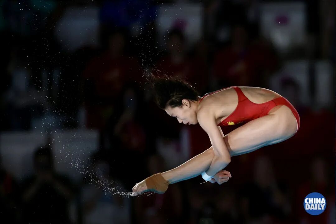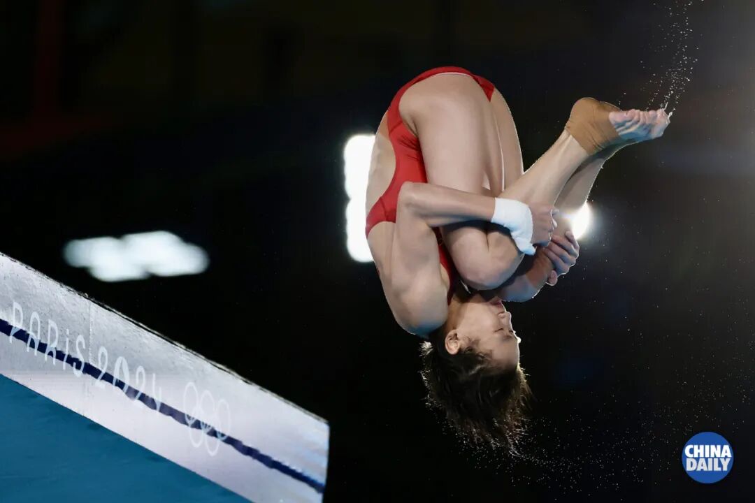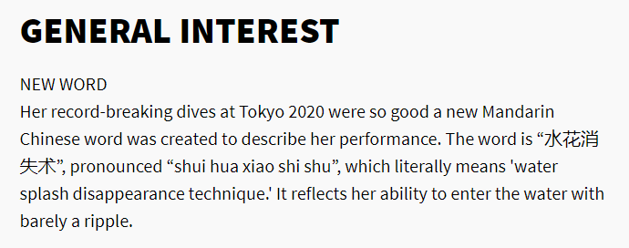 Her record-breaking dives at Tokyo 2020 were so good a new Mandarin Chinese word was created to describe her performance. The word is "水花消失术", pronounced "shui hua xiao shi shu", which literally means 'water splash disappearance technique.' It reflects her ability to enter the water with barely a ripple.
