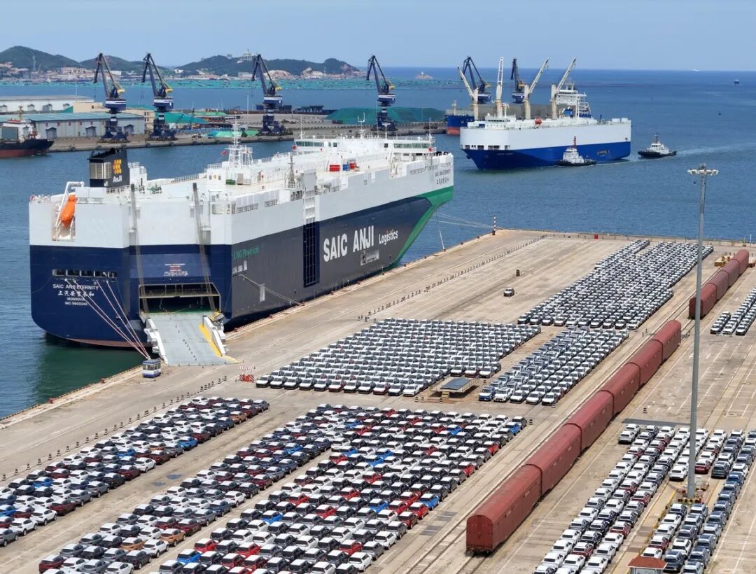 ▲Vehicles await loading to be transported at a terminal of Yantai Port in Shandong province on June 24. China exported 2.93 million vehicles in the first half of this year, up 25.3 percent year-on-year, according to the General Administration of Customs. ZHU ZHENG/XINHUA