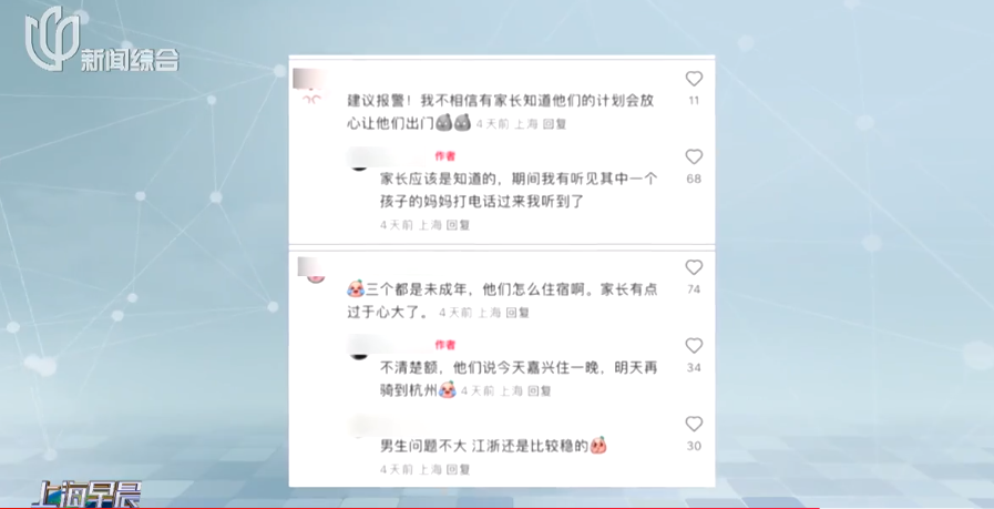 在三名“小孩哥”的骑行途中,途中碰到陌生人,经交流后了解了他们的计划,就把消息发在了网上,没想到评论区炸锅了,有佩服的,也有批评家长心太大的。