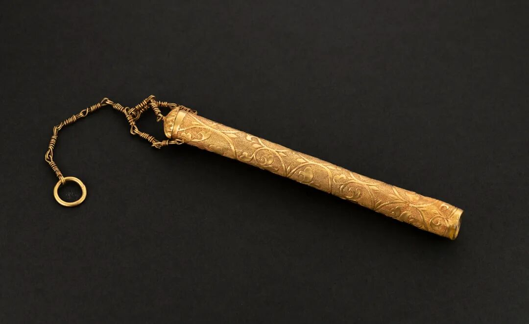 錾花金针筒,陈国公主与驸马合葬墓出土,出土时置于公主腰部左侧
