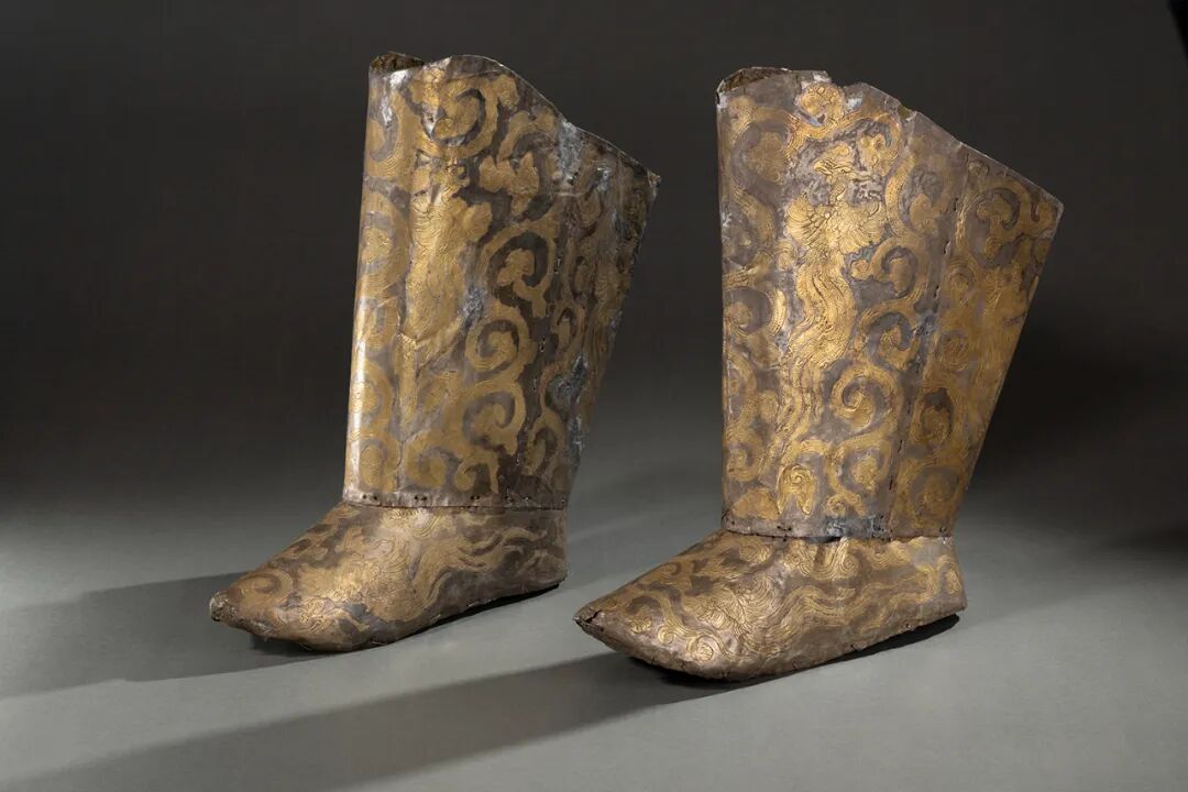 Found in their burial chamber were almost everything the couple might need for a pastoral life, including gilt silver boots worn that resembled “modern Western riding boots” to quote Johnson, as well as various horse gear — gilt copper chest traps, bridles and stirrups for example. There’s even a copper burning mirror for starting a fire, and a jade arm shield on which a hunting eagle could alight every time it returned to its master.