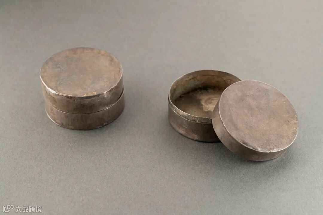 银盒,出土时置于龙纹金花银妆奁内,其中一盒内残留白色粉末,另外一盒内装有一块已变色的黑褐色胭脂