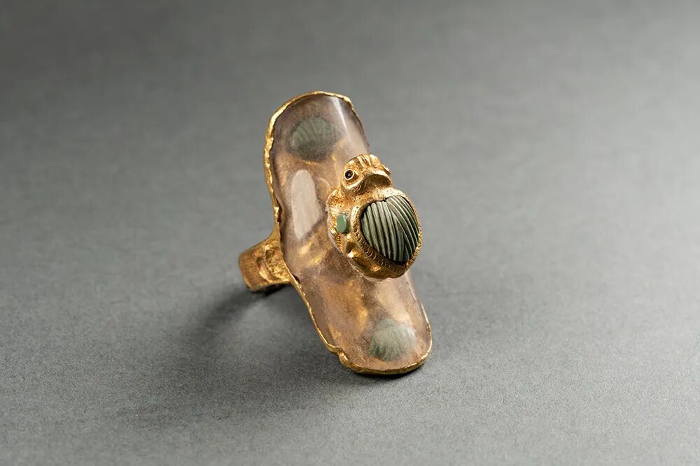 嵌水晶绿松石蟾蜍形金戒指,出土于通辽市吐尔基山辽墓,墓主被认为有可能是辽太祖耶律阿保机的妹妹余庐睹姑公主,戒指出土时佩戴于墓主手指上