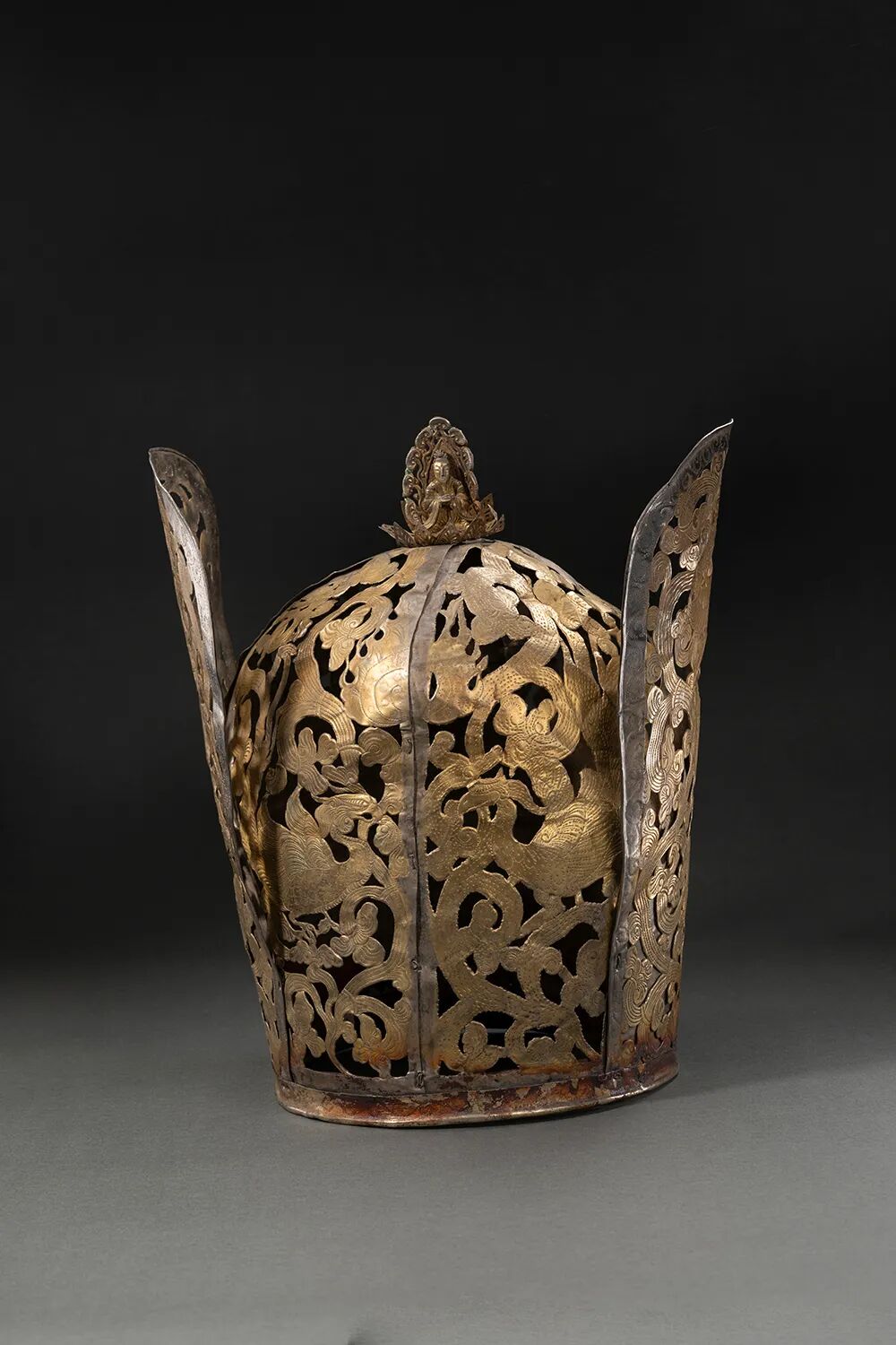 高翅鎏金银冠,冠顶缀道教元始天尊造像,陈国公主与驸马合葬墓出土,出土时置于公主头部上方左侧
