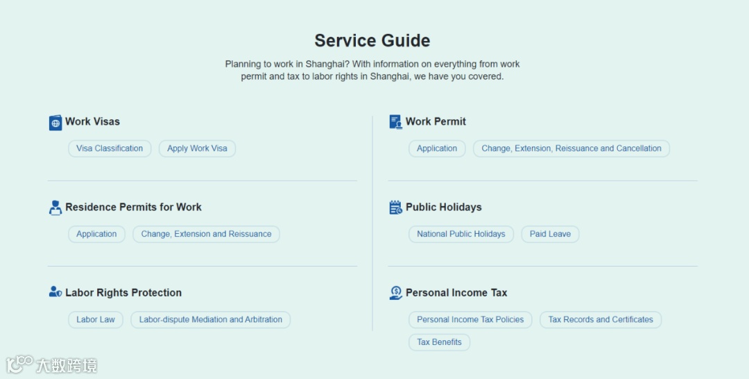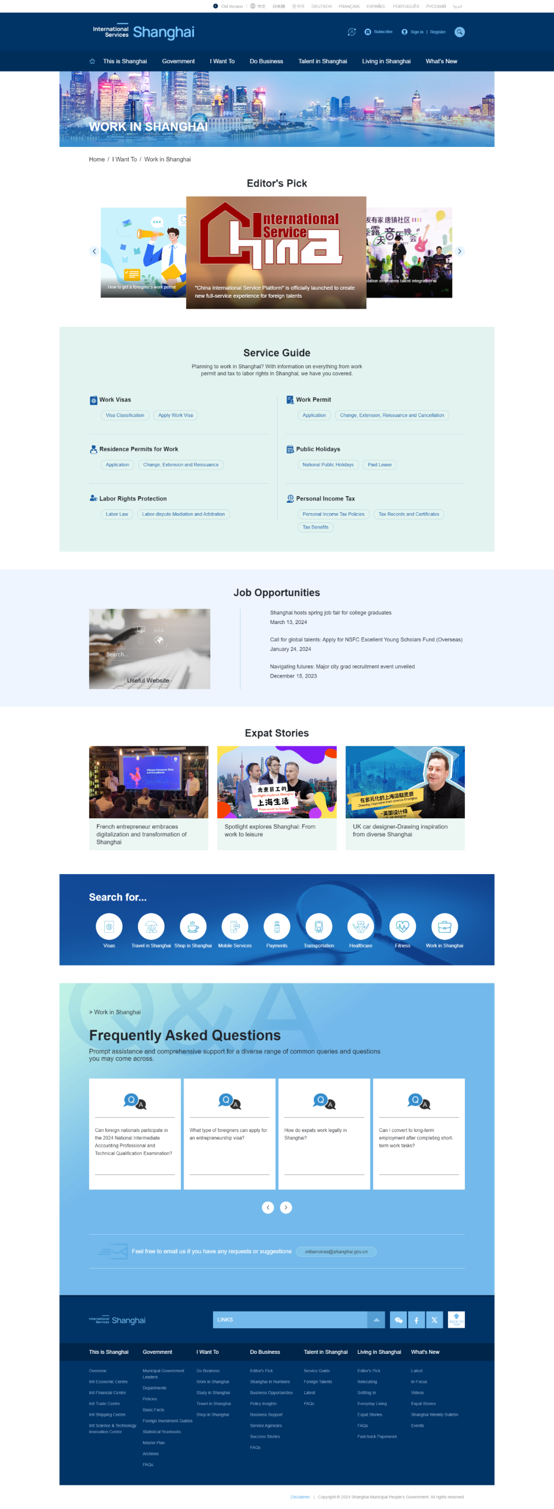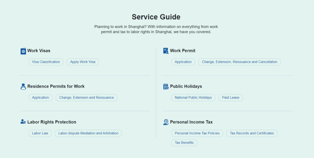 From processing work visas and residence permits to applying for permanent residency, the "Service Guide" section offers job seekers one-stop service information.