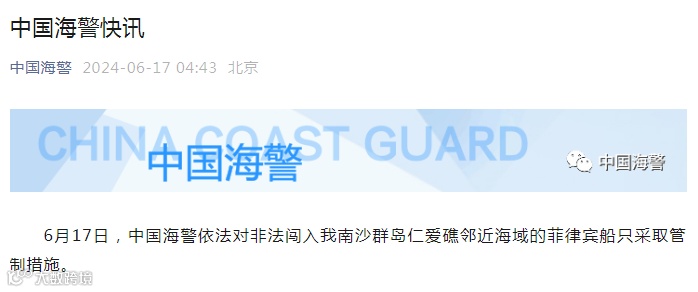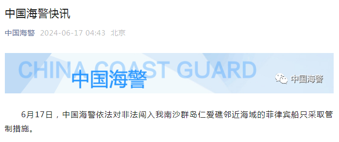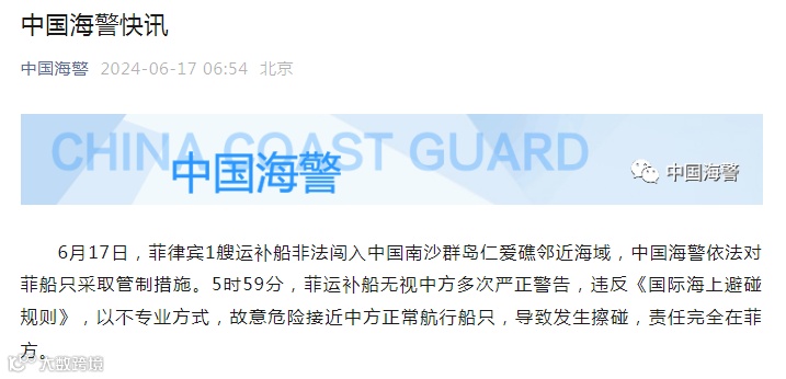 随后,“中国海警”微信公众号再次发布快讯,6月17日,菲律宾1艘运补船非法闯入中国南沙群岛仁爱礁邻近海域,中国海警依法对菲船只采取管制措施。5时59分,菲运补船无视中方多次严正警告,违反《国际海上避碰规则》,以不专业方式,故意危险接近中方正常航行船只,导致发生擦碰,责任完全在菲方。