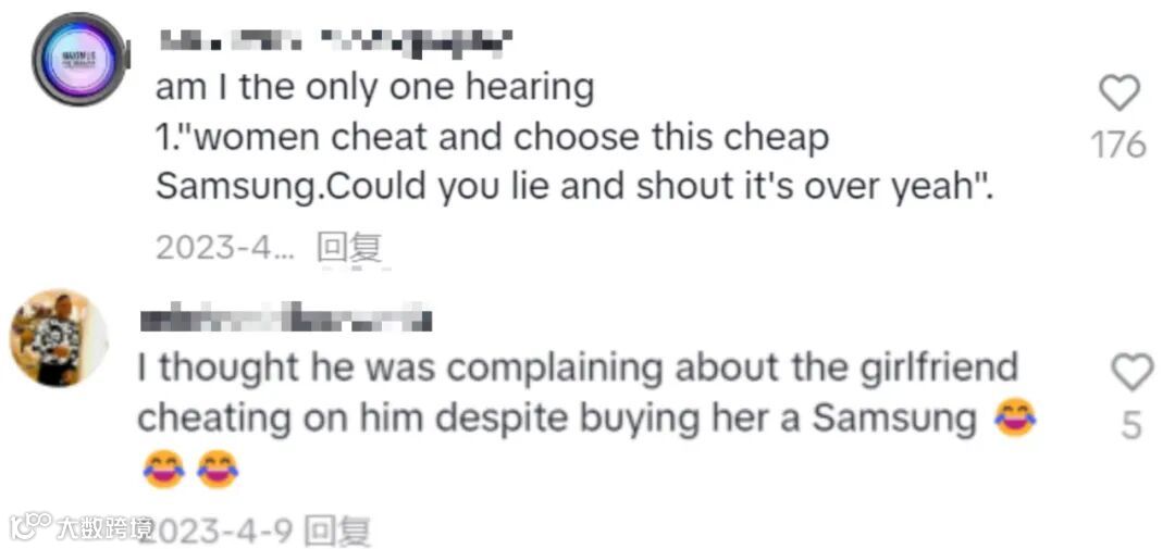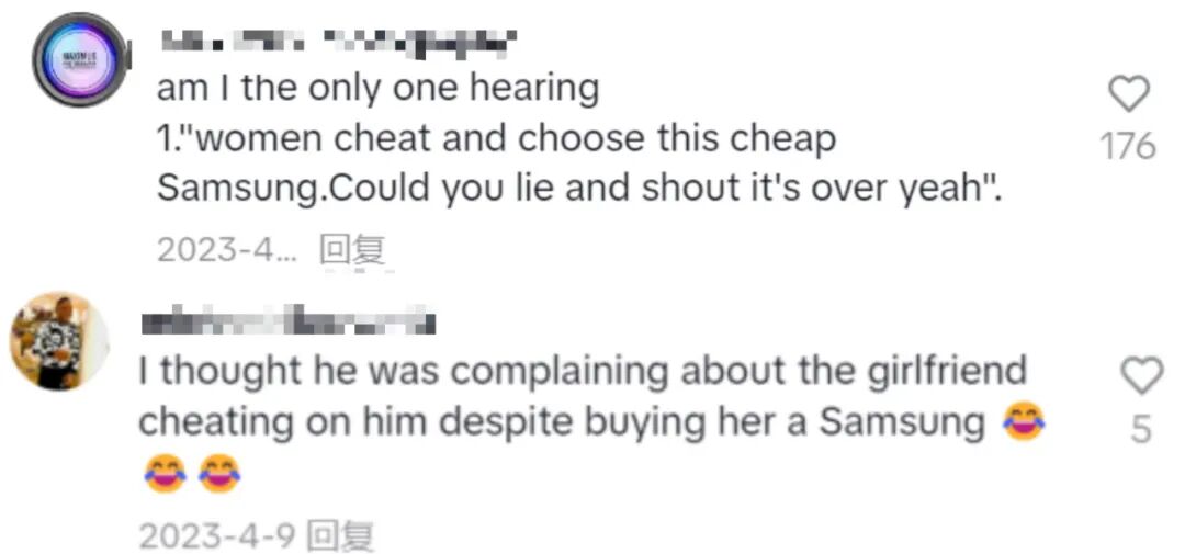 有网友把“我们今生”听成“woman cheat”,“沧桑”听成“Samsung(韩国手机制造商三星)”,于是恍然大悟:这讲述的是男人送了三星手机,但女朋友还是劈腿了的故事。
