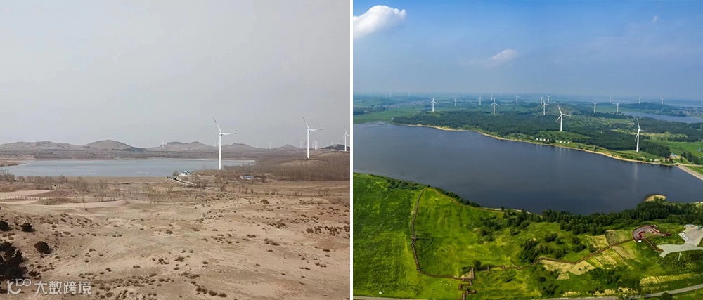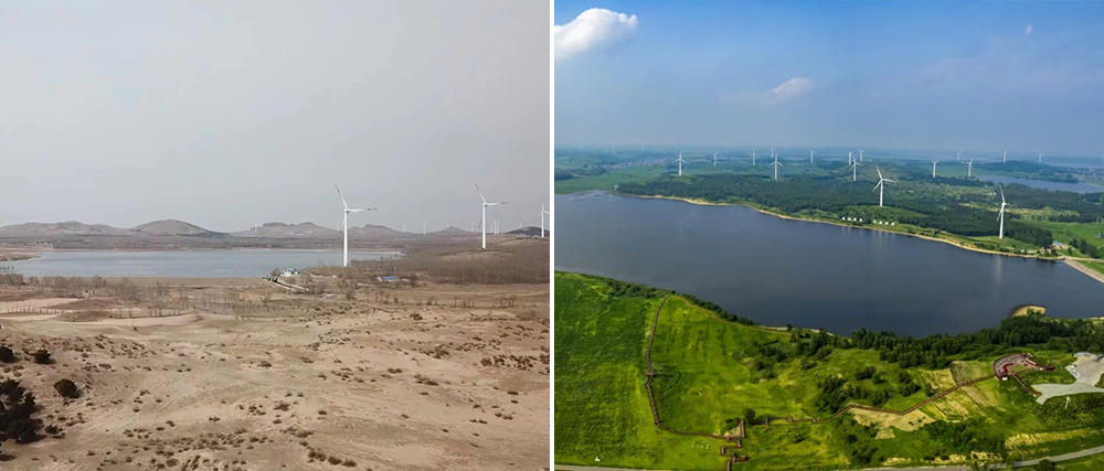 Photos taken at the same location on Ouli Mountain in Zhangwu county, Liaoning province, in 2018 and 2022 show a striking transformation from barren land to a green oasis.