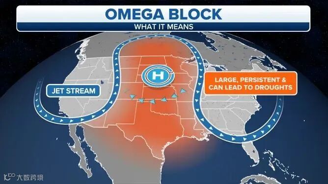 “热穹顶(heat dome)”不像“热浪(heat wave)”一样只是表面温暖,它还有深层暖空气和下沉干热空气带来的高压。它们是那种经常与沙漠条件有关的气团——并且具有一种特殊的急流模式,因其形状而被称为“欧米茄块(omega block)”,就像符号“Ω”一样。
