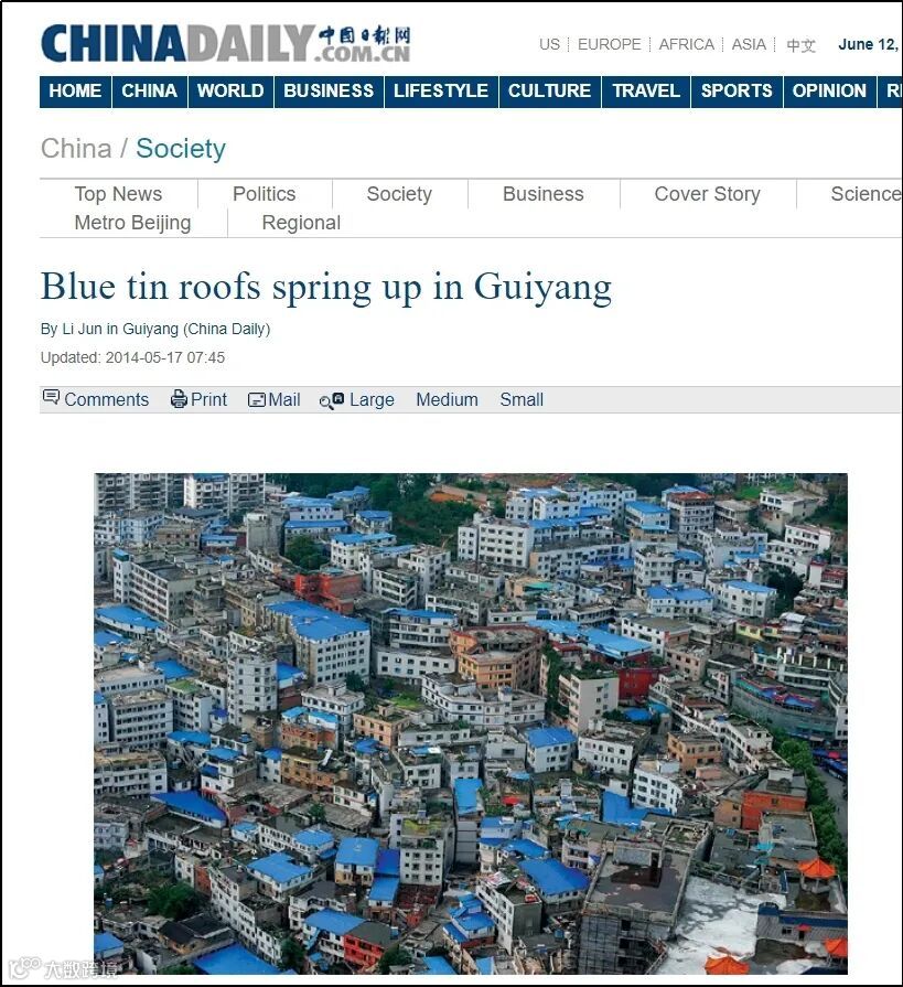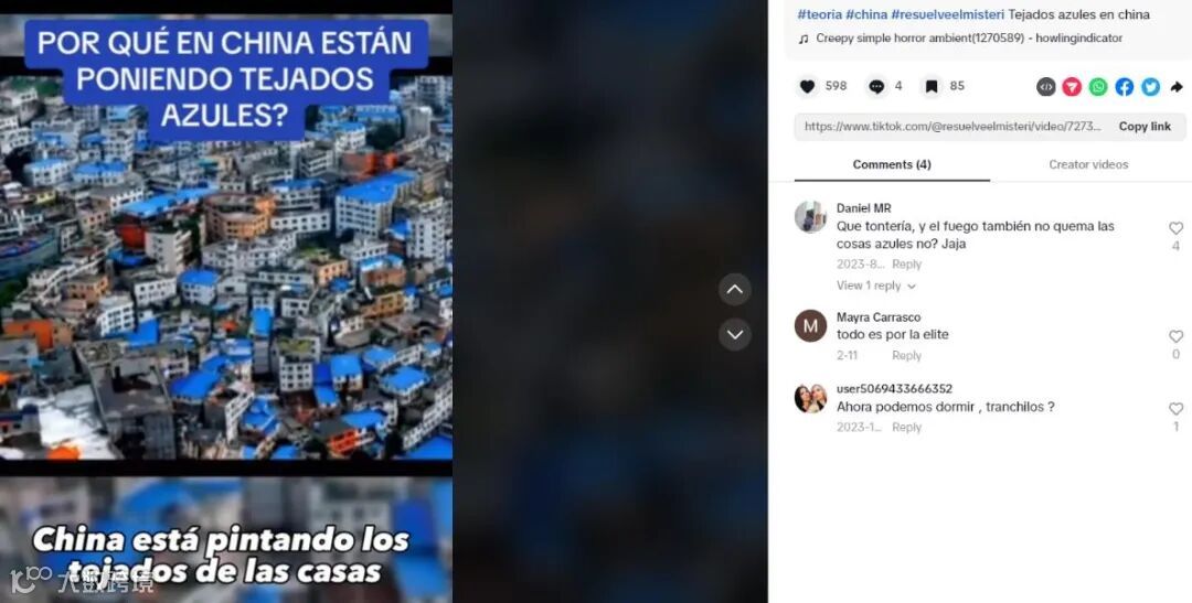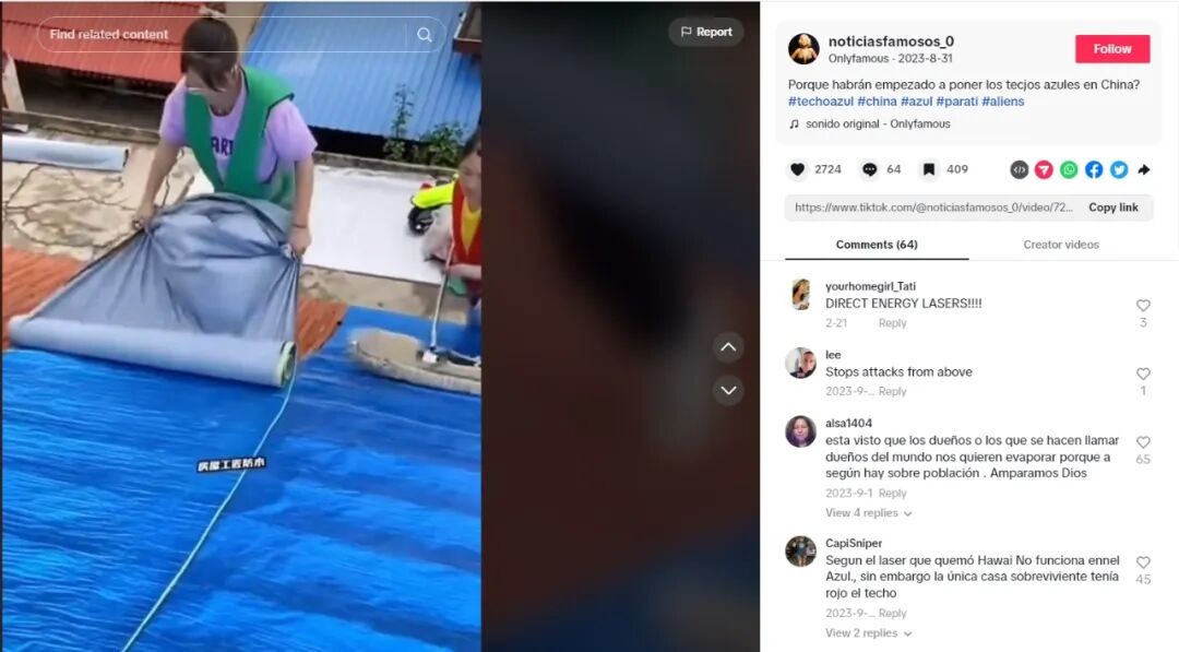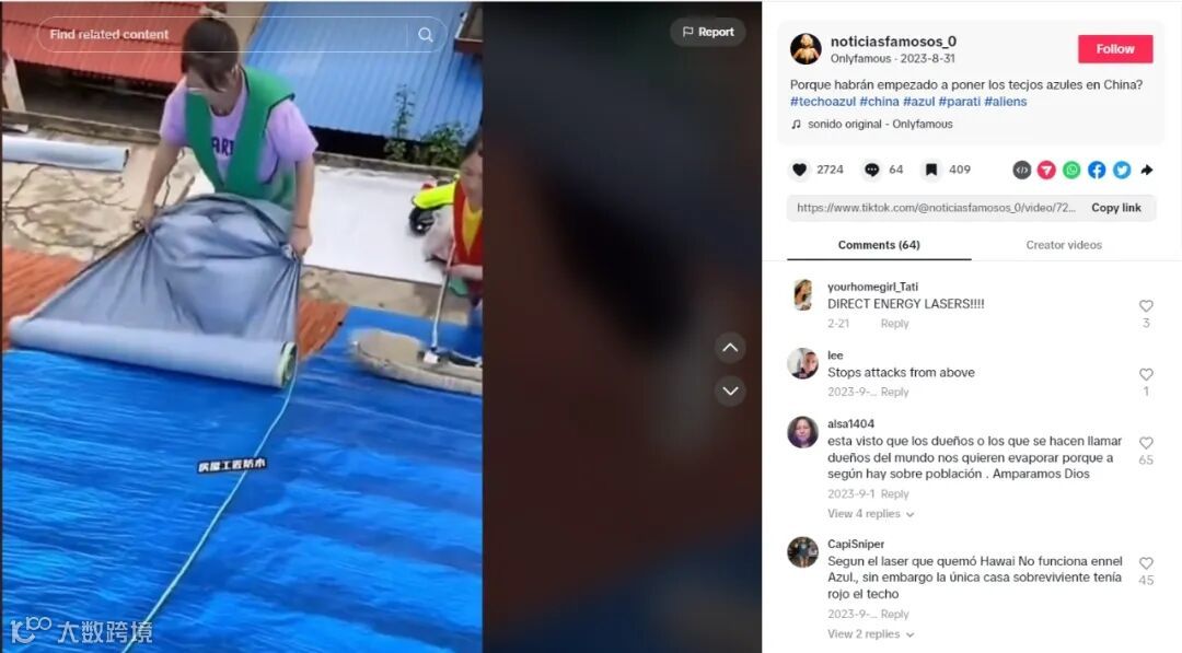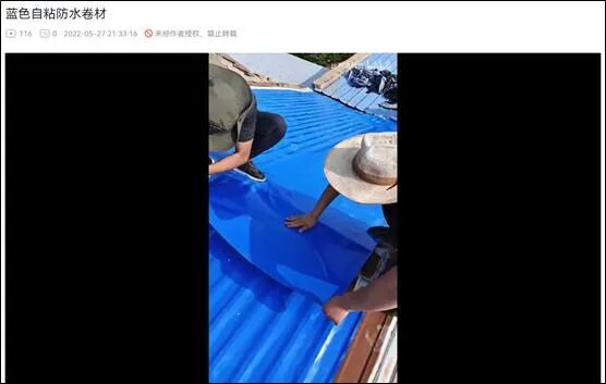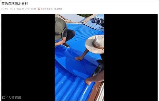 其实,除了这名博主外,自今年3月开始,就有大量美国等国家的网民转发中国网络上常见的防水卷材广告,声称“中国人正将屋顶涂成蓝色”——尽管流传最广的视频中,赫然打着“房屋工程防水” 的水印。