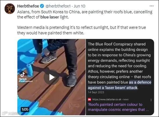 6月10日,一位美国网络博主转发了一段视频称:“中国等亚洲国家正在把屋顶弄成蓝色,以此屏蔽激光武器”。