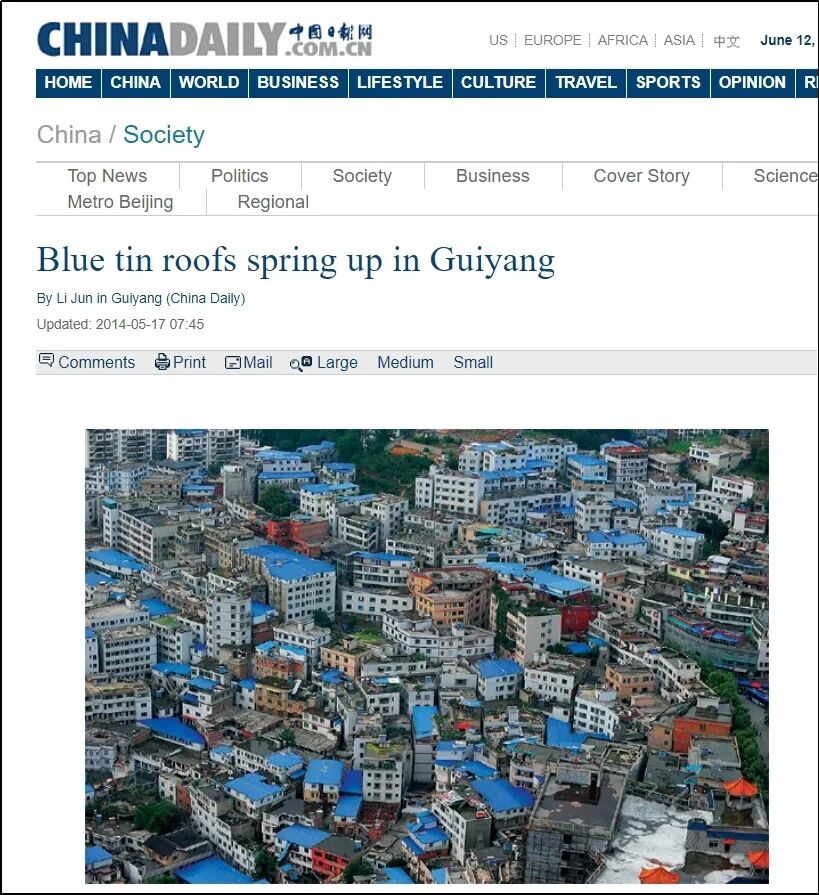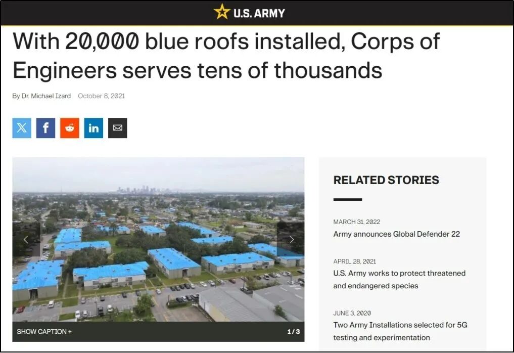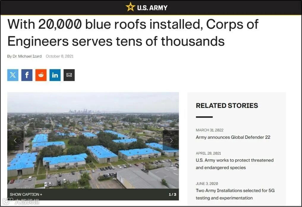而另外两个“证据”则来自媒体。其一是一篇2014年发布的文章,内容是介绍贵阳的居民给屋顶贴防水布解决雨水渗漏问题。另一个则是美国陆军官网2021年的报道,讲的是美军为官兵建造了新营房。
