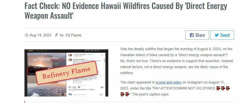 来自美国事实核查网站PolitiFact的一篇文章表示,之前网上流传的“定向能武器(Directed energy weapons)”,也就是前文提到的“激光武器”,并不是造成夏威夷毛伊岛山火的原因。