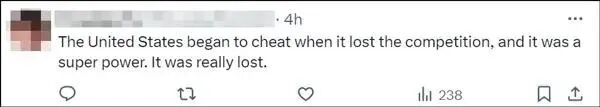 “当美国在竞争中失利时,它就开始作弊。”网友感叹说,这才是真正输了比赛。