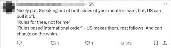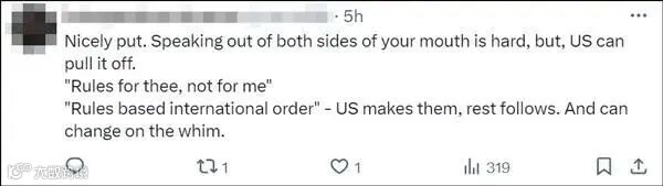 对于华春莹的解读,有外国网友评论表示,说两面话很难,但美国却可以轻易说出,美方所谓的规则是为他人制定的,而且随心所欲地进行修改。
