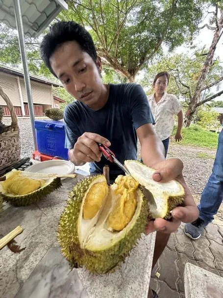The easiest litmus test of a durian's freshness is to scratch its stem gently with your fingertips. If the stem reveals a fleshy and leaf-green interior without much effort, it is a sign that the durian had fallen off the trees within the last 24 hours. 检验榴莲新鲜程度的最简单方法就是用指尖轻轻刮一下榴莲的梗子,如果刮开呈饱满肉质和黄绿色,就说明榴莲采摘不到24小时。