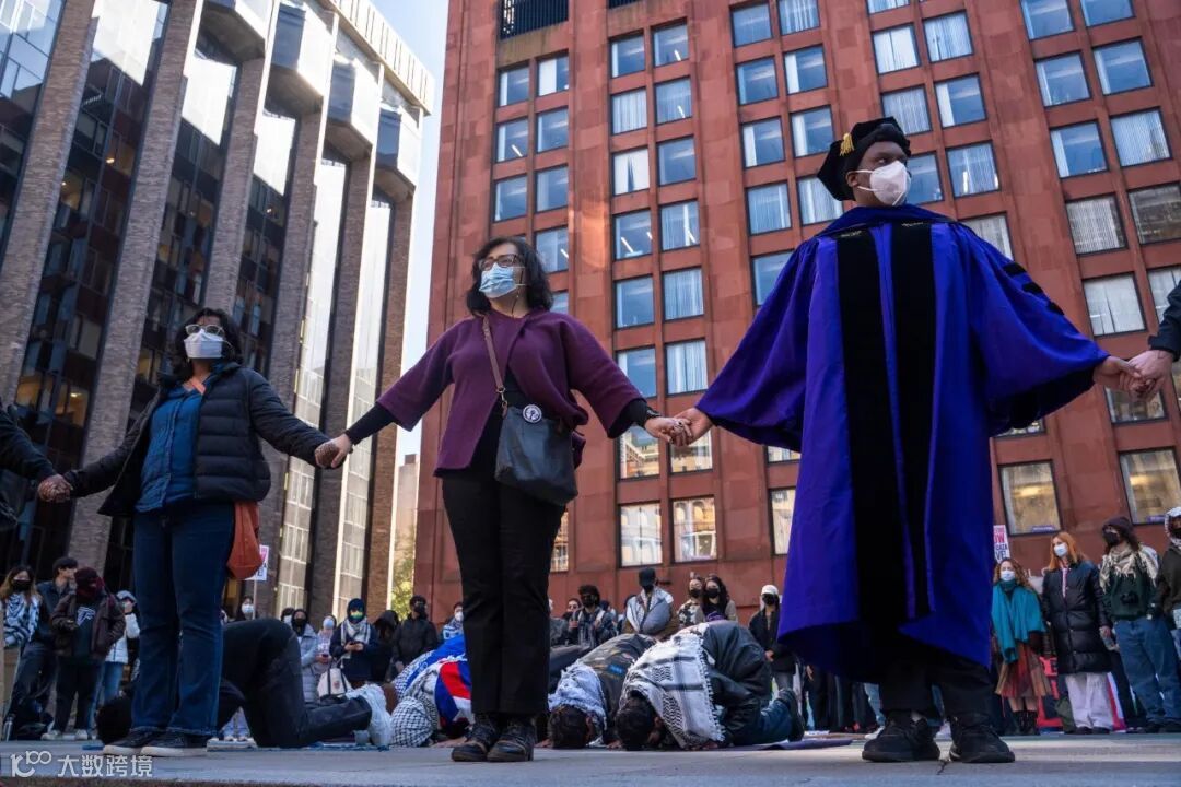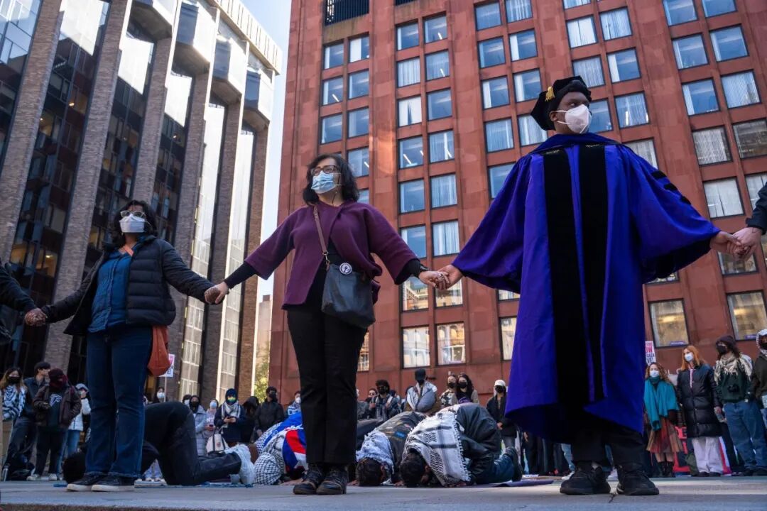 在纽约大学,面对学生被捕或被勒令停学的情况,一些教师穿上了他们的学位服,手拉手组成人墙保护学生。几十名教职员工同时致信管理层,称他们对校方对扎营抗议的反应“深感不安”,并称纽约市警察局的干预是“大学的污点”。