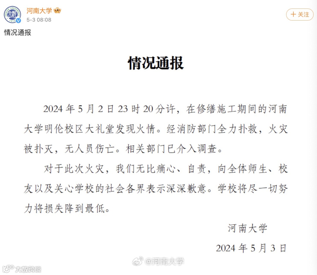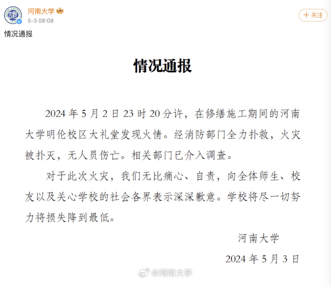 5月3日上午,河南大学官方微博发布情况通报称:“对于此次火灾,我们无比痛心、自责,向全体师生、校友以及关心学校的社会各界表示深深歉意。学校将尽一切努力将损失降到最低。”