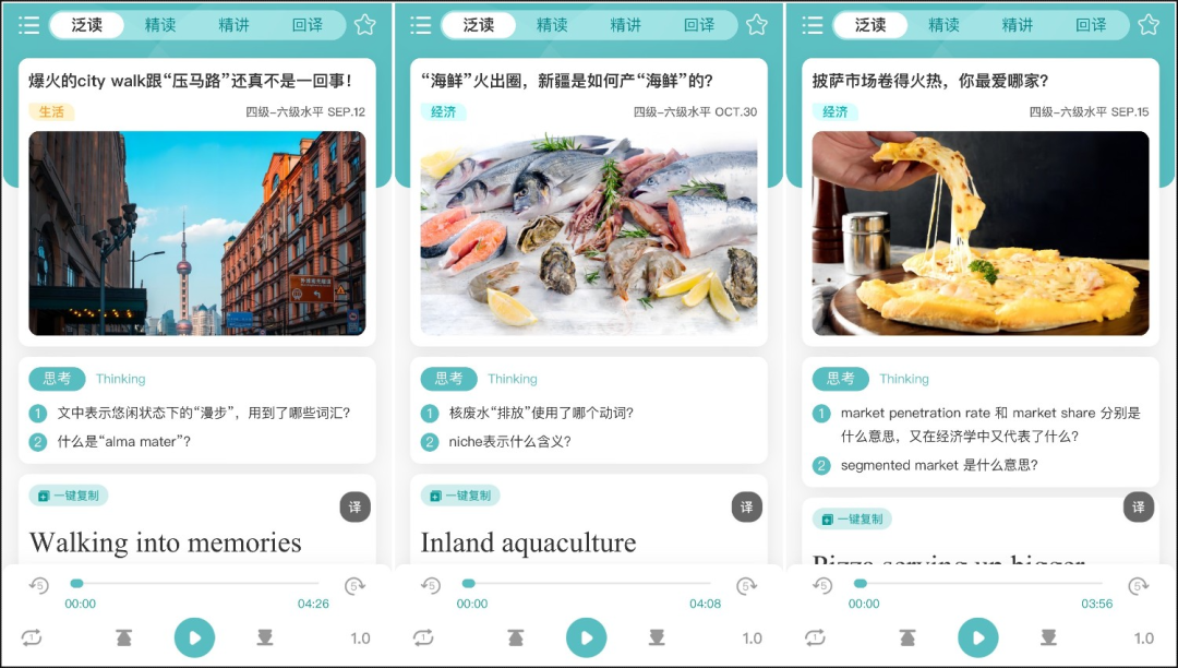 一键复制全文、点击查词、音频倍速切换、一键翻译、单词本、记笔记、搜索文章、主题筛选......