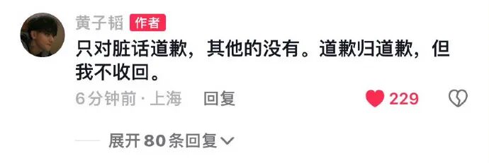 “对于在今晚演出中我最后的一些不当言论,在此向主办方、品牌方、所有观众致以真诚的歉意。身为公众人物,我的言行起到了不好的示范作用,造成了不良影响。为此,我将引以为戒,接受大家的批评和监督,不再有此类情况发生。希望今晚的小插曲,不要伤害到任何人,也不要影响大家的心情,再次感谢大家今晚的到来,祝大家晚安。”