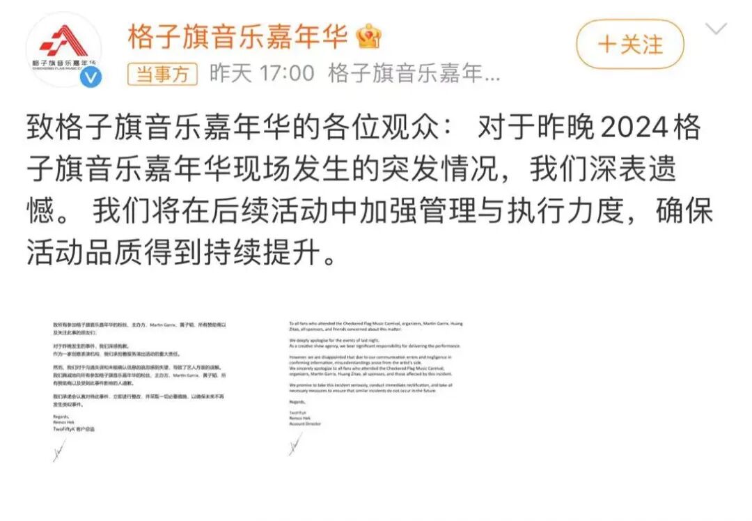 21日,活动主办方格子旗音乐嘉年华发文致歉,对于昨晚现场的突发情况深表遗憾,称由于沟通失误和未能确认信息的疏忽,导致艺人方面的误解,向Martin Garrix、黄子韬等所有参与者及受到影响的人道歉。并承诺立即整改,采取一切必要措施,以确保未来不再发生类似事件。