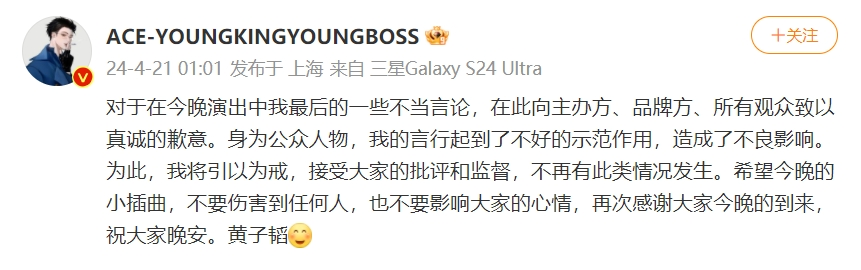 For my inappropriate remarks during tonight's performance, I sincerely apologize to the organizers, sponsors, and all the audience. As a public figure, my words and actions have set a bad example and caused a negative impact. Therefore, I will take this as a lesson, accept everyone's criticism and supervision, and ensure that such situations do not occur again. I hope tonight's little incident will not harm anyone or affect everyone's mood. Once again, thank you all for coming tonight. Good night.
