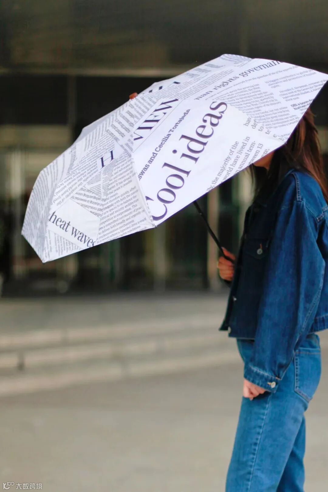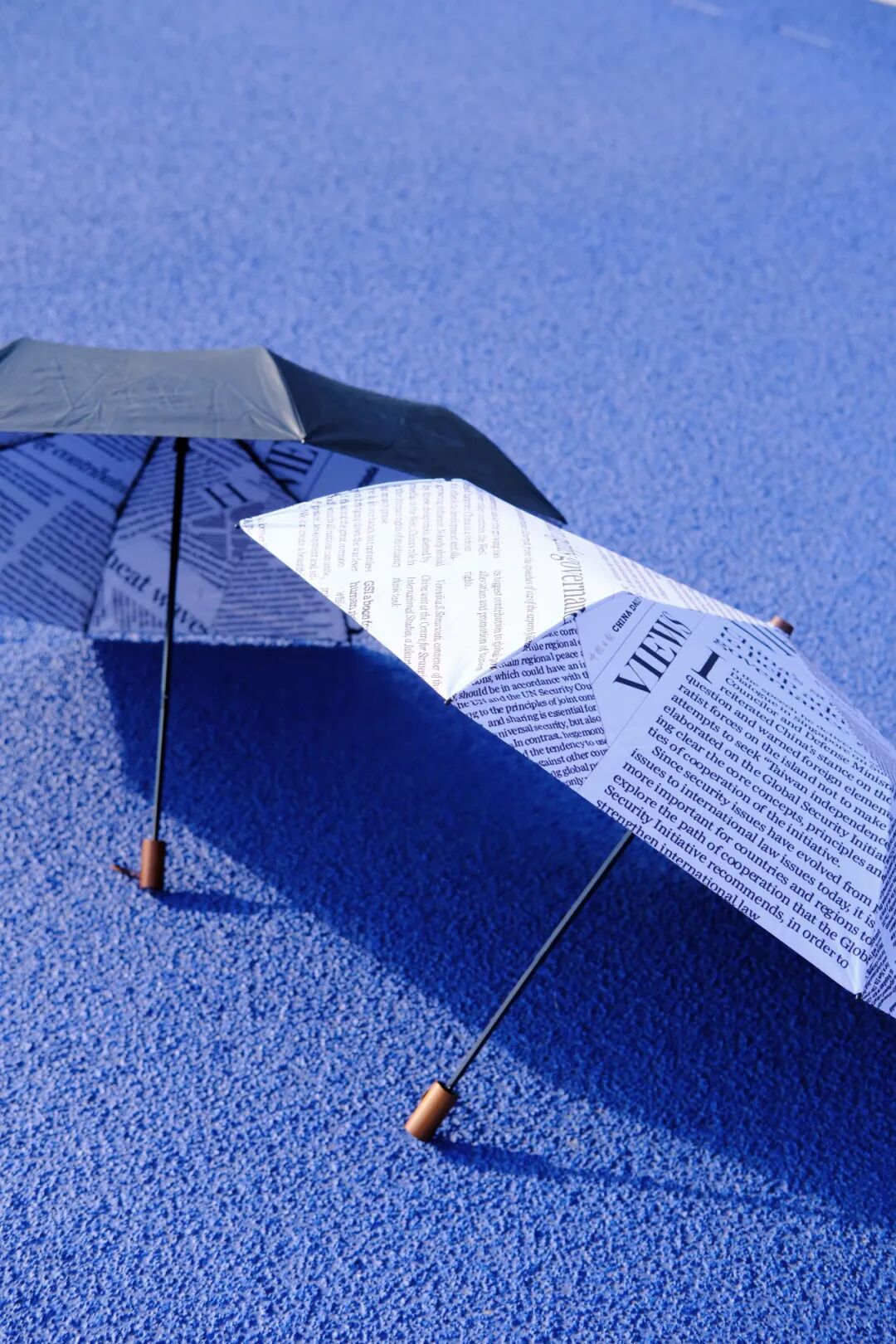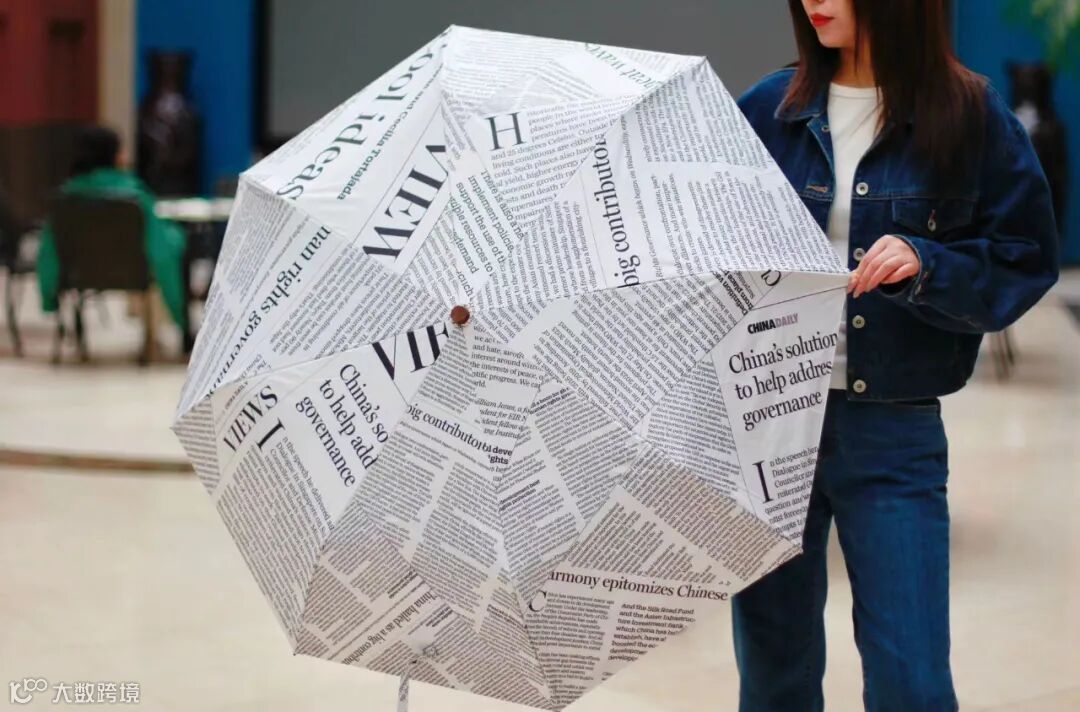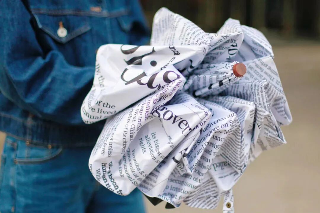 China Daily版面晴雨伞外观设计同样出彩,一面用报纸版面拼接而成,一面选用黑胶布防水材质,经典黑白配色,简约而不失时尚。