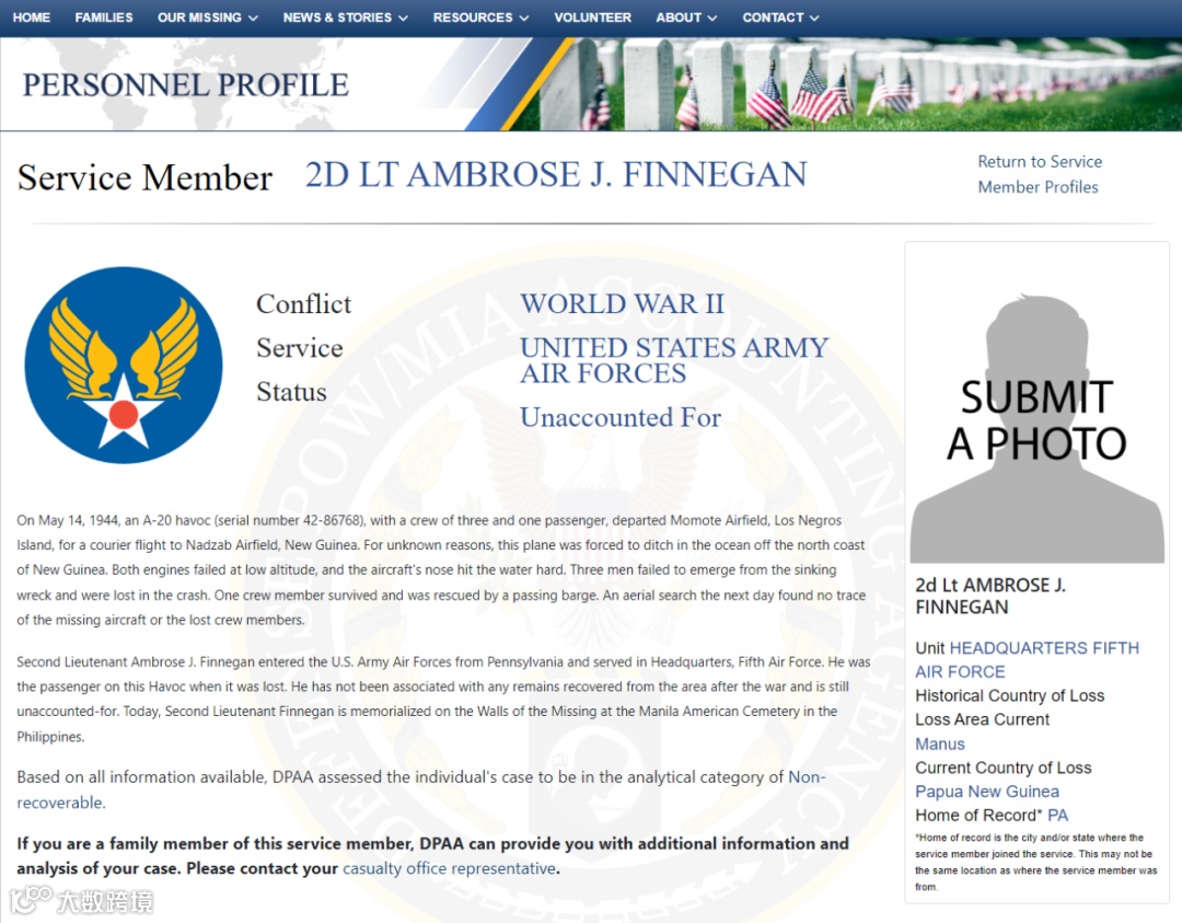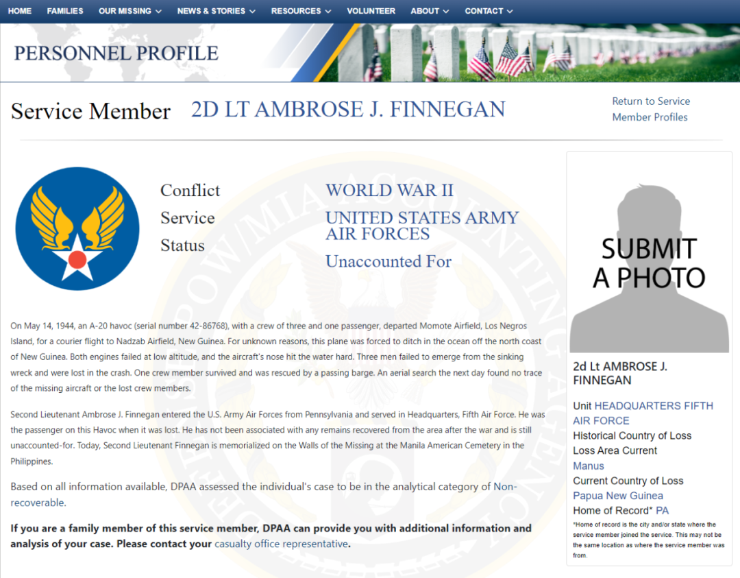 美国国防部战俘及失踪人员管理档案网页截图