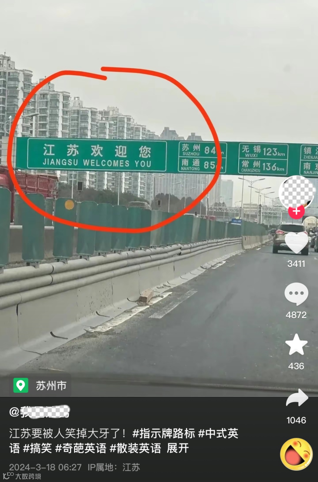 起因是一位博主发了一张高速路上“江苏欢迎您”的标语照片,配文“江苏要被人笑掉大牙了”。应该是在说其英文翻译——“Jiangsu welcomes you”。