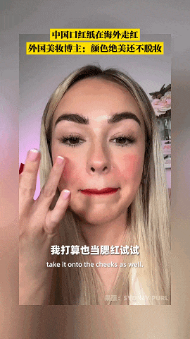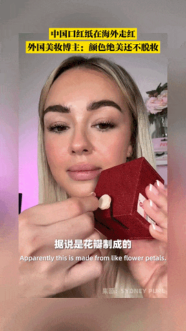 另一位英国美妆博主也拍摄了同款口红纸试色短视频。这位博主在视频开头就直接标出了“试用中国口红纸(Trying Chinese lipstick paper)”。