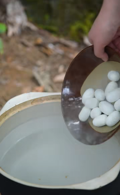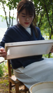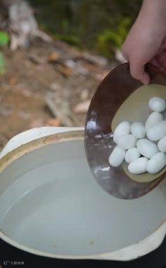 @黔乡古月 在视频中详细介绍了这种传统口红的制作方法。制作口红纸的第一步是做蚕丝纸,选取轻软而富有韧性的蚕茧,剥去表面的绒毛后放在水中蒸煮至松软,便可抽取出需要的蚕丝。