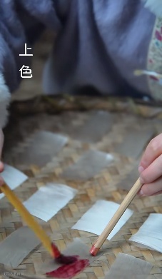 下一步是上色。挤出火龙果里面的汁液,加热蒸煮浓缩至粘稠,涂在竹网上裁好的蚕丝纸片上,风干过后,美丽的古法口红纸就做好了。