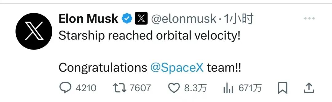 在火箭发射升空后,14日晚些时候,SpaceX 公司创始人马斯克在社交平台上发帖称,“‘星舰’已达到环绕速度!祝贺 SpaceX 团队!!”
