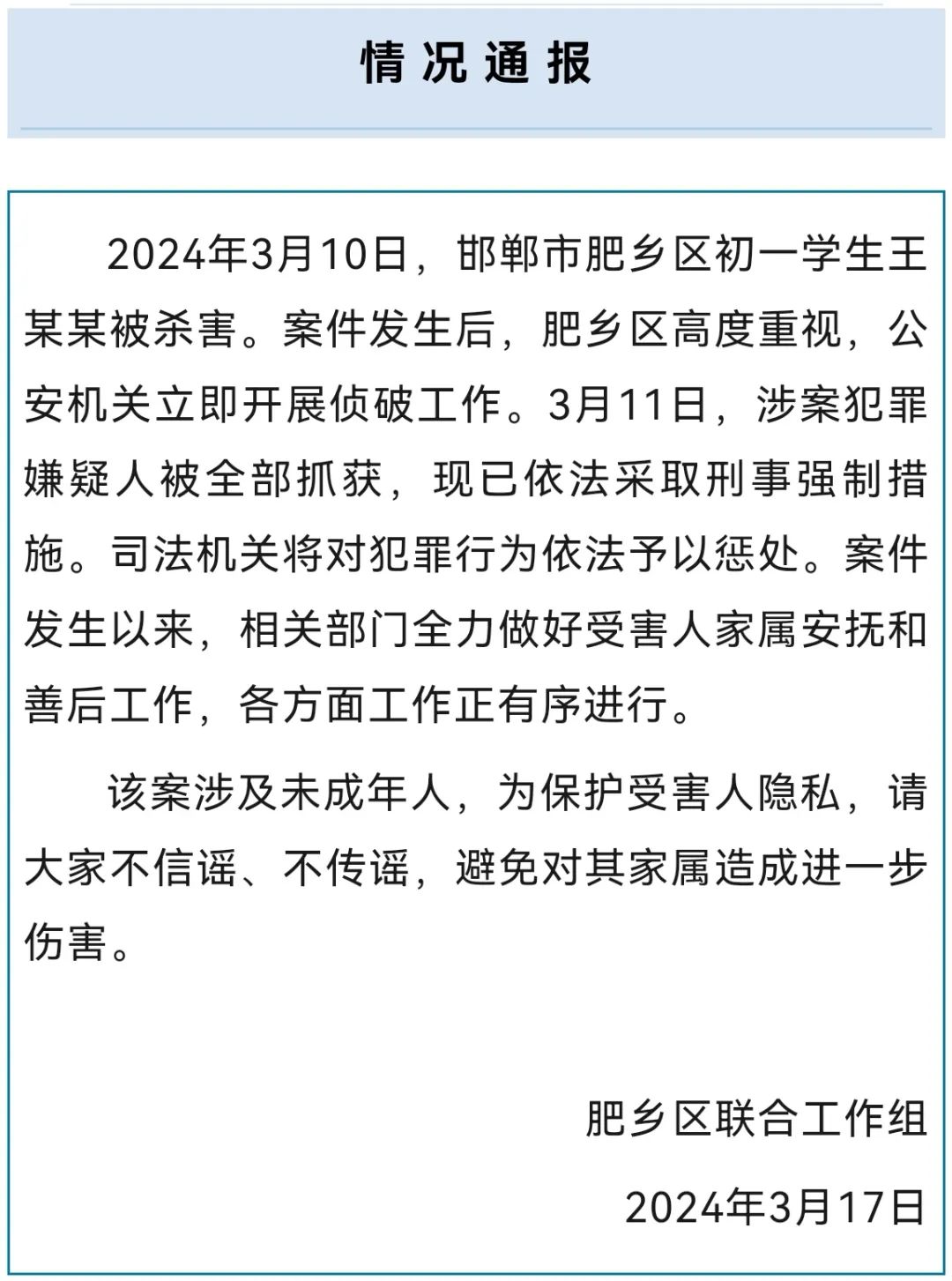 All suspects reportedly involved in the killing of a middle school student by classmates in Feixiang district of Handan, Hebei province, have been detained and placed under criminal coercive measures in accordance with the law, according to a statement by local authorities on Sunday night.