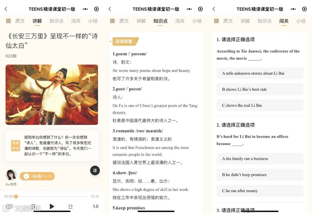 在优质文章内容的基础上,我们努力还原课堂语篇精讲的场景,完成了“精读课堂”的内容设计: