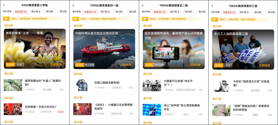 我们的精读课沿袭报纸优势,选题内容丰富多彩:时政热点、奇闻趣事、中国文化、人文地理.....
