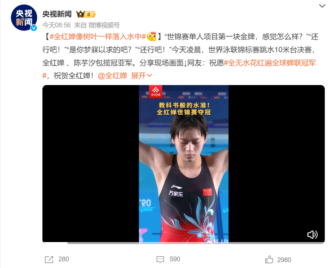 央视则在解说中说:“全红婵像树叶一样落入水中。”