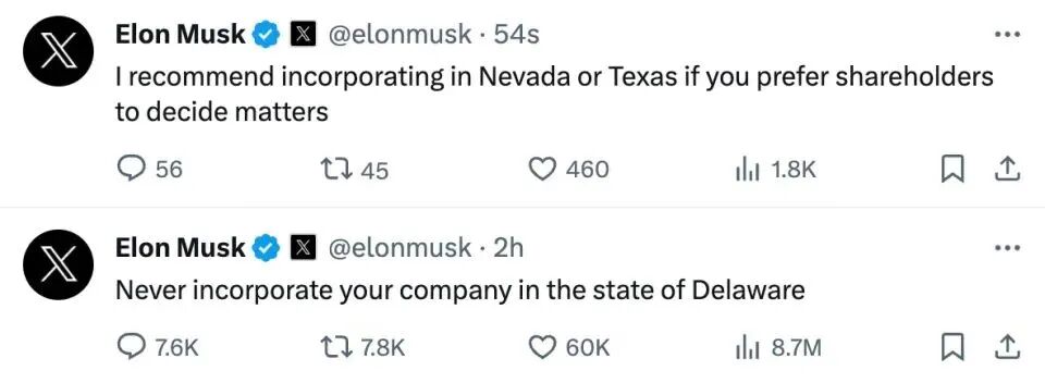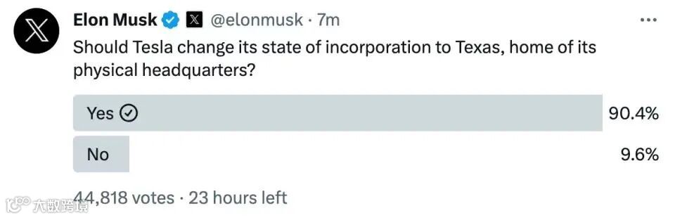 随后,马斯克在社交平台回应其560亿美元特斯拉薪酬计划被否,“永远不要在特拉华州注册公司”。他还就特斯拉是否应该将其注册地更改为得克萨斯州发起投票。