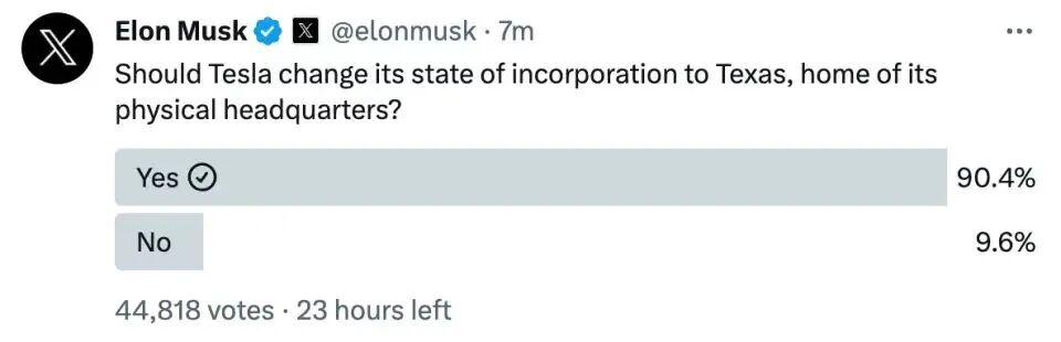 “I recommend incorporating in Nevada or Texas if you prefer shareholders to decide matters,” he said in a second tweet. He also put up a poll on X asking if Tesla should change its state of incorporation to Texas, where its headquarters is based. As of 7 am ET, 88% of those responding to the poll were voting yet.