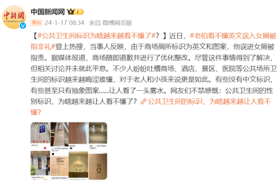 尽管这件事情得到了解决,但相关讨论并未就此平息。不少人纷纷吐槽商场、酒店、景区、医院等公共场所卫生间的标识越来越晦涩难懂,对于老人和小孩来说更是如此。有些没有中文标识,有些甚至只有抽象图案……让人看了一头雾水。