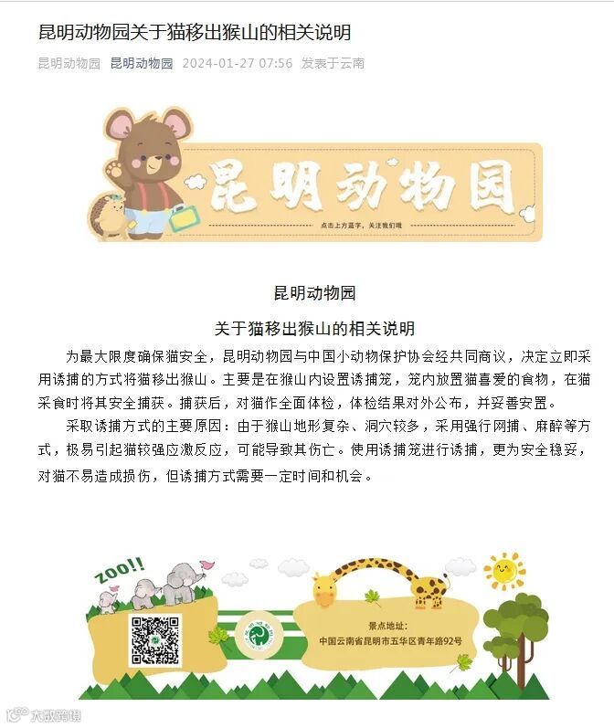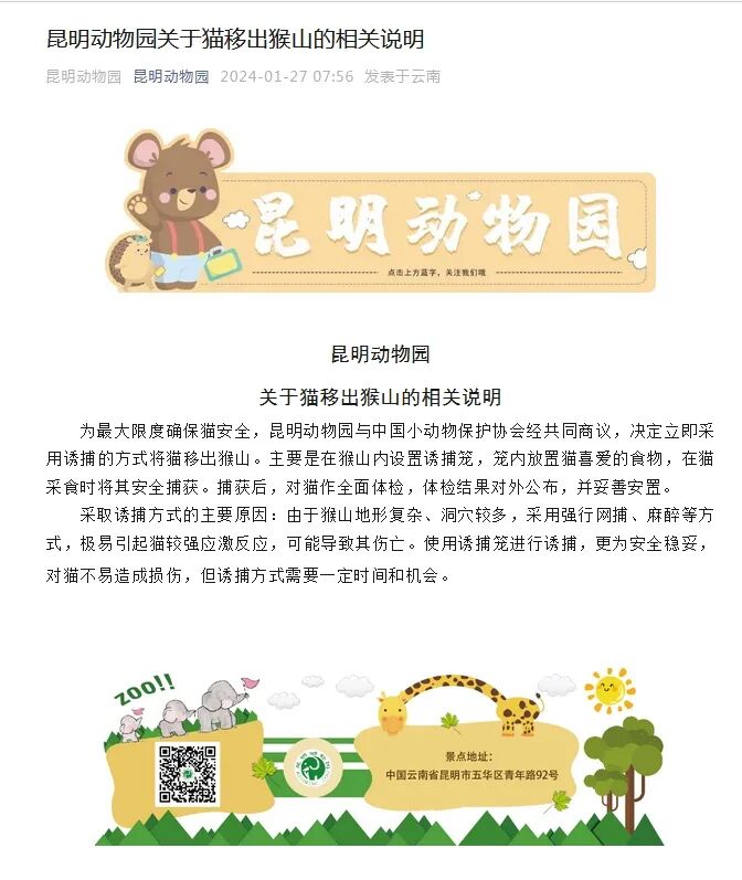 为最大限度确保猫安全,昆明动物园与中国小动物保护协会经共同商议,决定立即采用诱捕的方式将猫移出猴山。主要是在猴山内设置诱捕笼,笼内放置猫喜爱的食物,在猫采食时将其安全捕获。捕获后,对猫作全面体检,体检结果对外公布,并妥善安置。