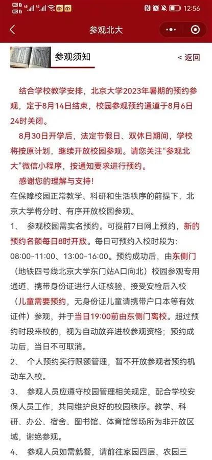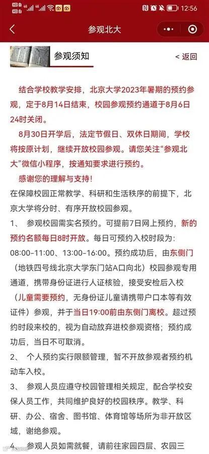 同时,北大将增加游览时间。此前的7月份,北大发布公告称,2023年7月8日,北大恢复校园预约参观通道。一般情况下,寒暑假、法定节假日及双休日期间,开放校园参观。每日可预约时段为:09:00-11:00、14:00-16:00,且需于当日19:00前离校。此次,北大表示,为提高游客参观体验,将接待游客入校时间每日上、下午各提前一小时,离校时限每日上、下午各延后一小时。