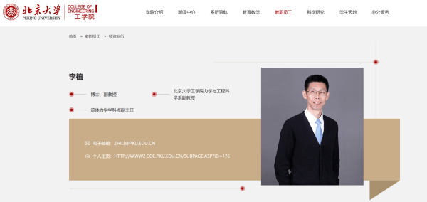 据北京大学工学院网站提供的信息介绍,李植目前是北京大学工学院力学与工程科学系副教授,并担任流体力学学科点副主任。李植的本硕博都在莫斯科大学数学力学系就读,1999年9月进入北京大学力学与工程科学系,历任讲师、副教授。