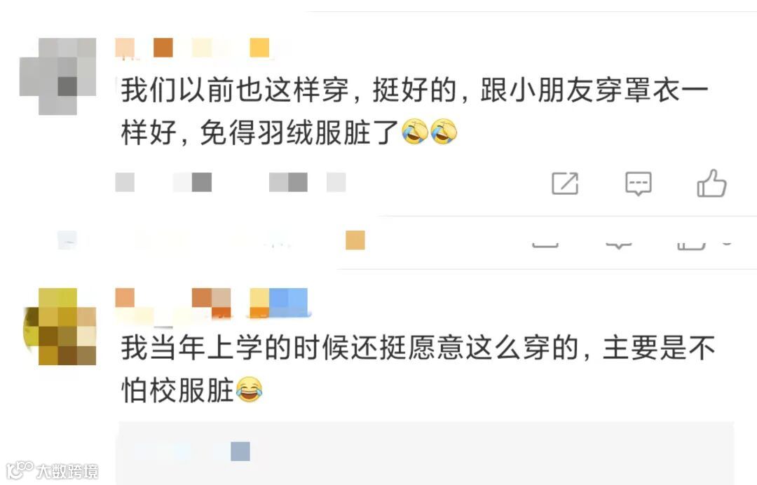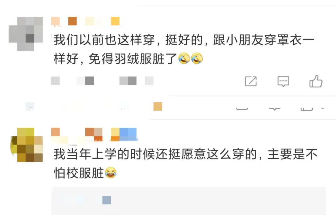 对部分学校“寒冬校服外穿”的规定,有网友表示“不能理解”,也有人觉得“挺好的”“不怕脏”。
