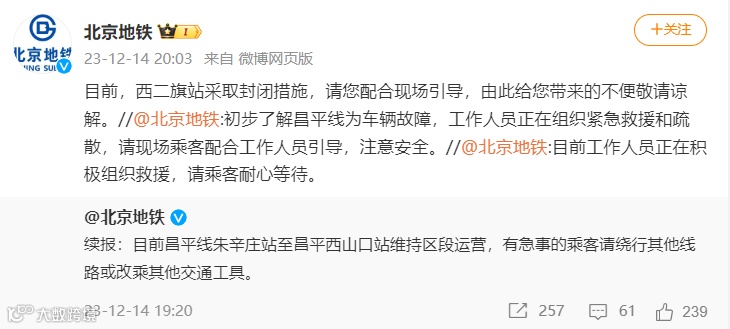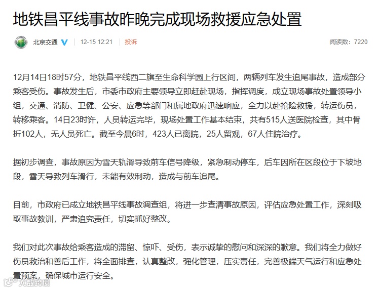 @北京交通订阅号 15日中午发布消息:12月14日18时57分,地铁昌平线西二旗至生命科学园上行区间,两辆列车发生追尾事故,造成部分乘客受伤。事故发生后,市委市政府主要领导立即赶赴现场,指挥调度,成立现场事故处置领导小组,交通、消防、卫健、公安、应急等部门和属地政府迅速响应,全力以赴抢险救援,转运伤员,转移乘客。